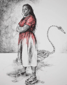 Barbara Walker’s retrospective Being Here is a breathtaking combination of superlative illustrations, thematic breadth and depth. Spanning time and space, Walker imprints the Black presence on the European story where it has been erased, neglected or under-documented. Each portrait in her Turner Prize-nominated series Burden of Proof revives the human story behind the Kafkaesque cruelty of our immigration system. In conversation with Burden of Proof, the series Shock and Awe is an enthralling portrait of Black service personnel. Perhaps it is due to my obsession with Baldwin’s Go Tell It on the Mountain (1953) that I found her depiction of Black Christians in prayer, with a soft-faced youth in the foreground, the most haunting of all the portraits in the collection.